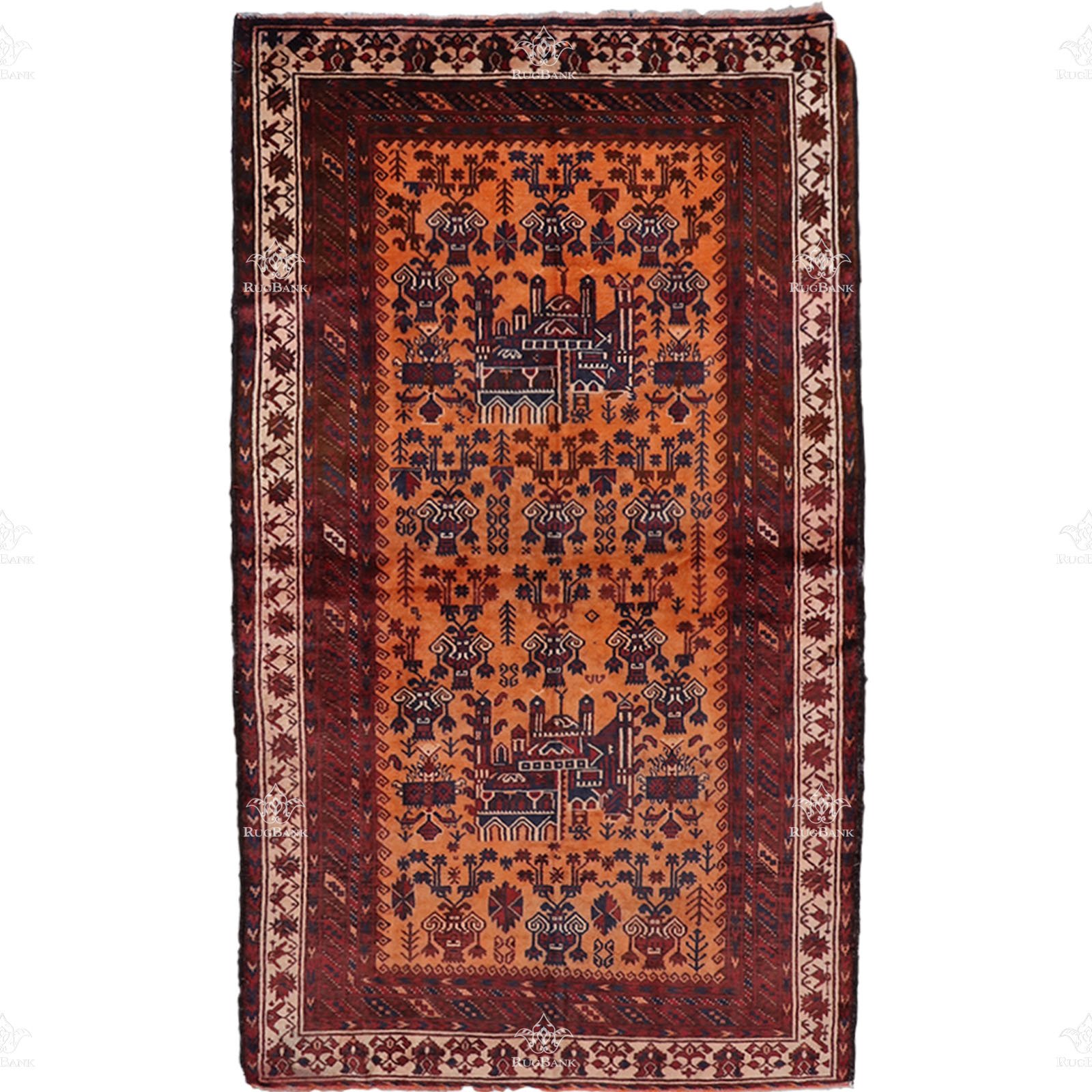 Every thread in this rug is a work of art, reflecting the skill and creativity of our artisans. The vibrant orange backdrop serves as a canvas for a captivating pictorial design that adds depth and character to your decor.