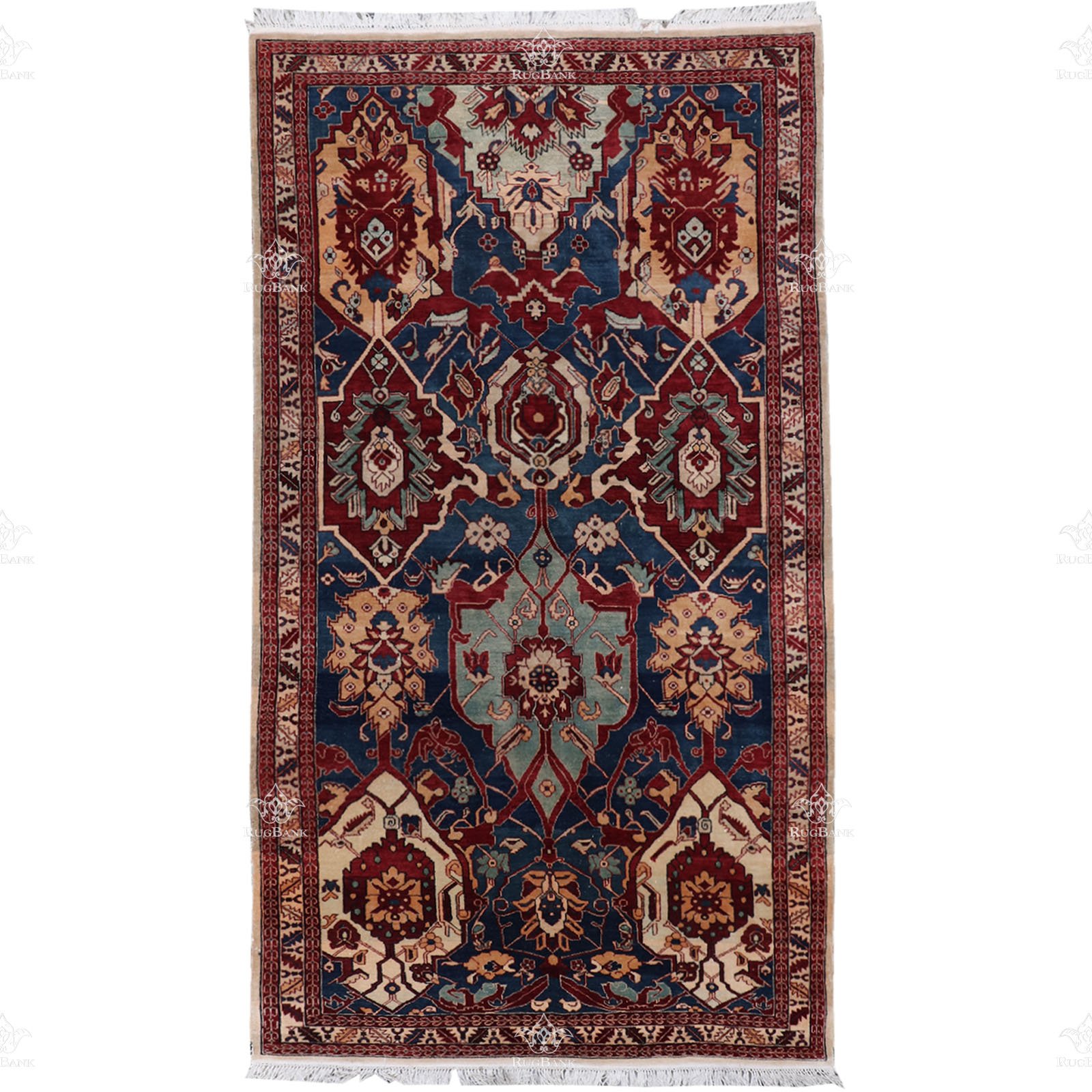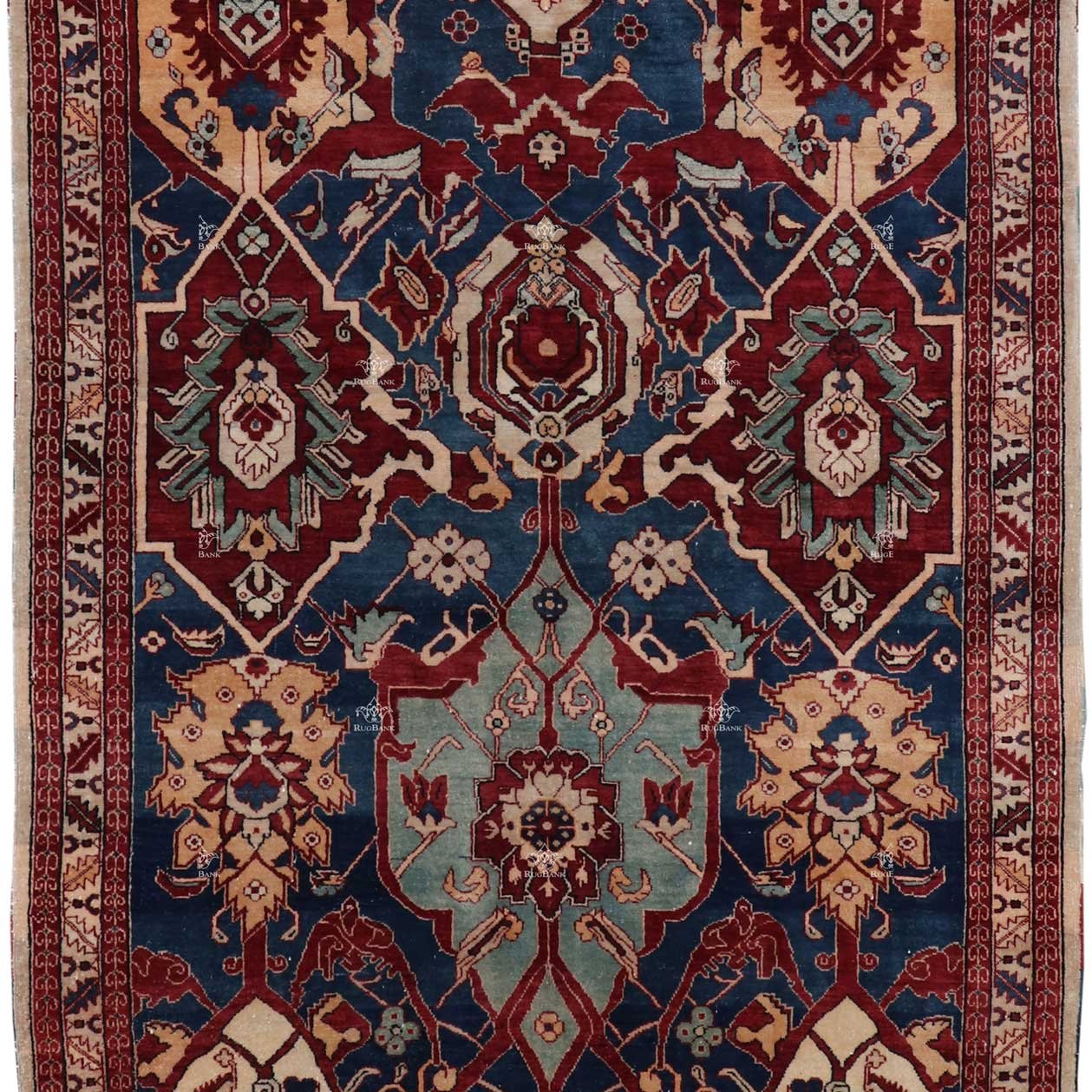 Handmade Indian rug featuring bold motifs, a navy blue background, and striking ivory and red accents. These exquisite rugs are not just beautiful pieces of art but also symbols of tradition, craftsmanship, and heritage.