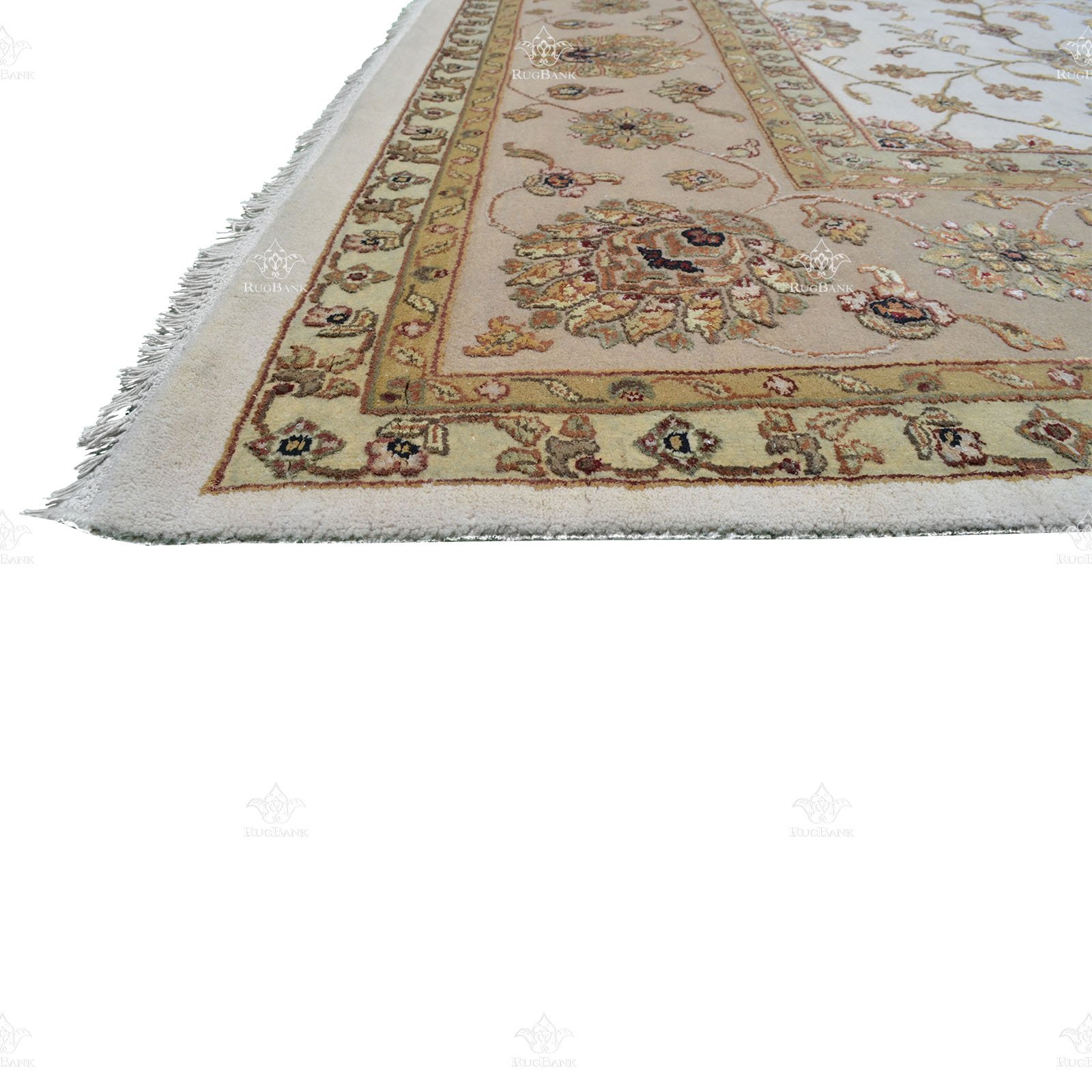 The traditional Indian floral design of this rug is truly a work of art. With a white background in the middle and an ivory background on the border, the intricate golden motifs scattered all over the rug add a touch of opulence and elegance. The combination of these colors and patterns creates a timeless and classic look that is perfect for both traditional and modern interiors.