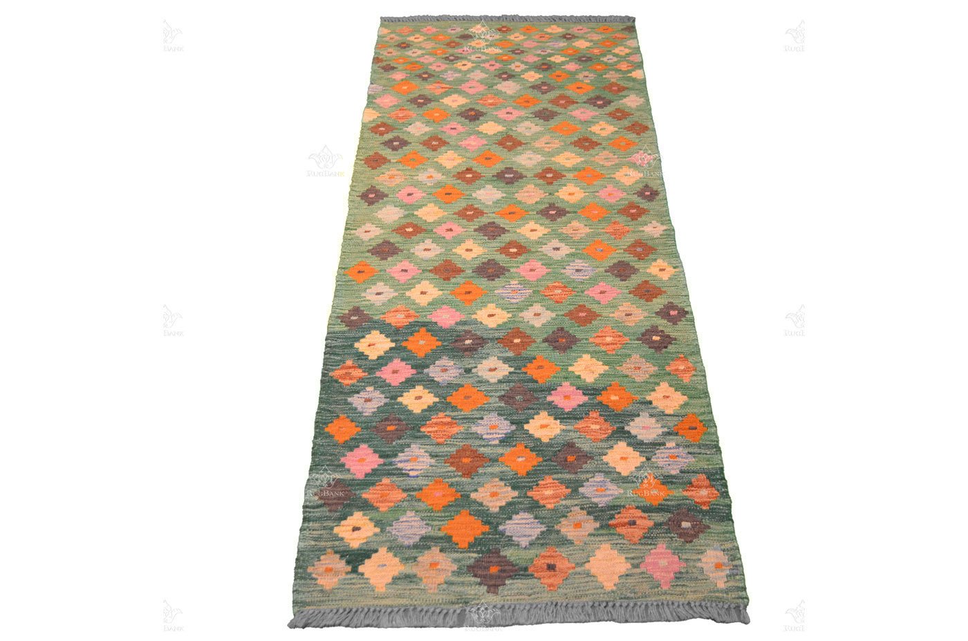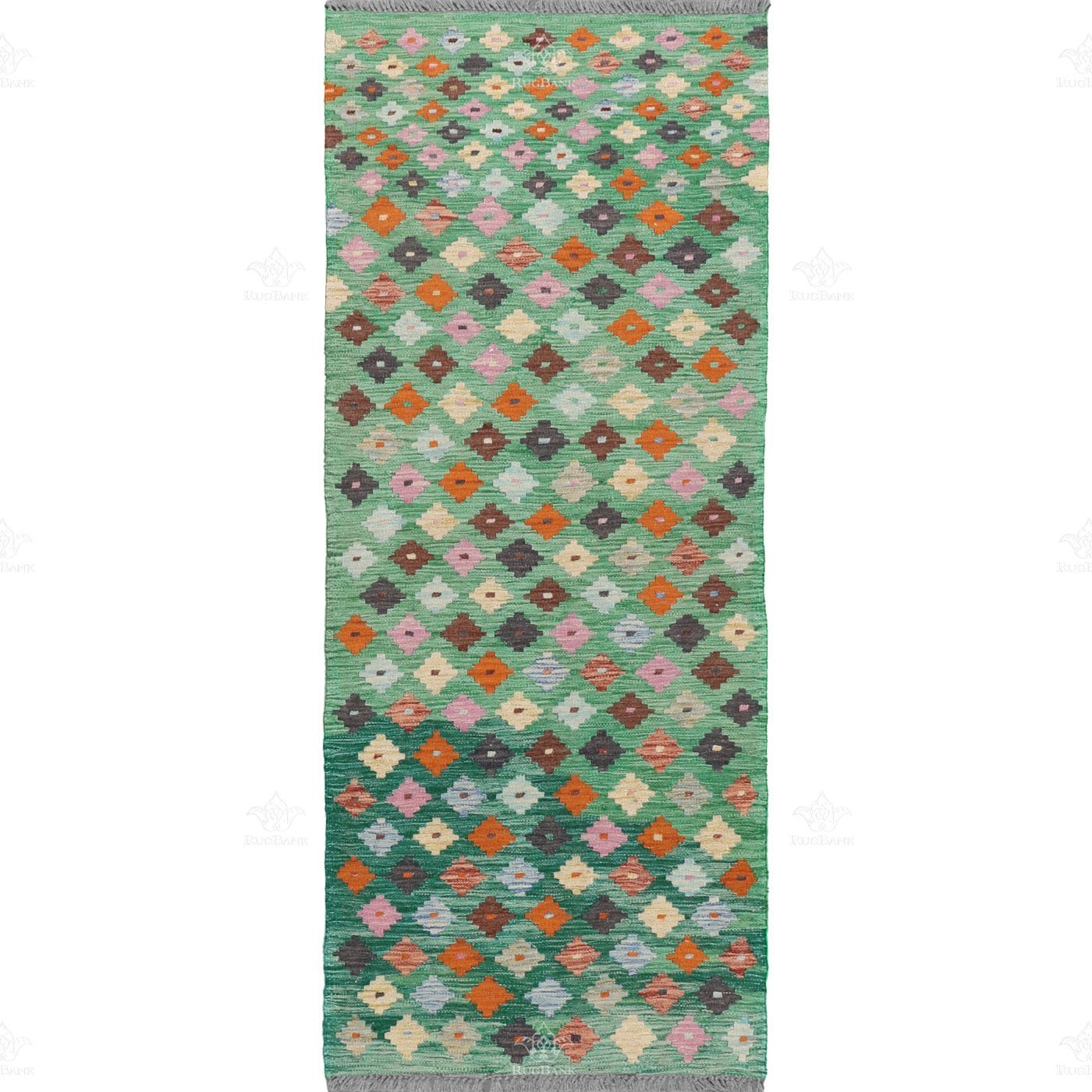 Unique Handmade Runner Kilim: Bright Green Elegance with Diamond Patterns