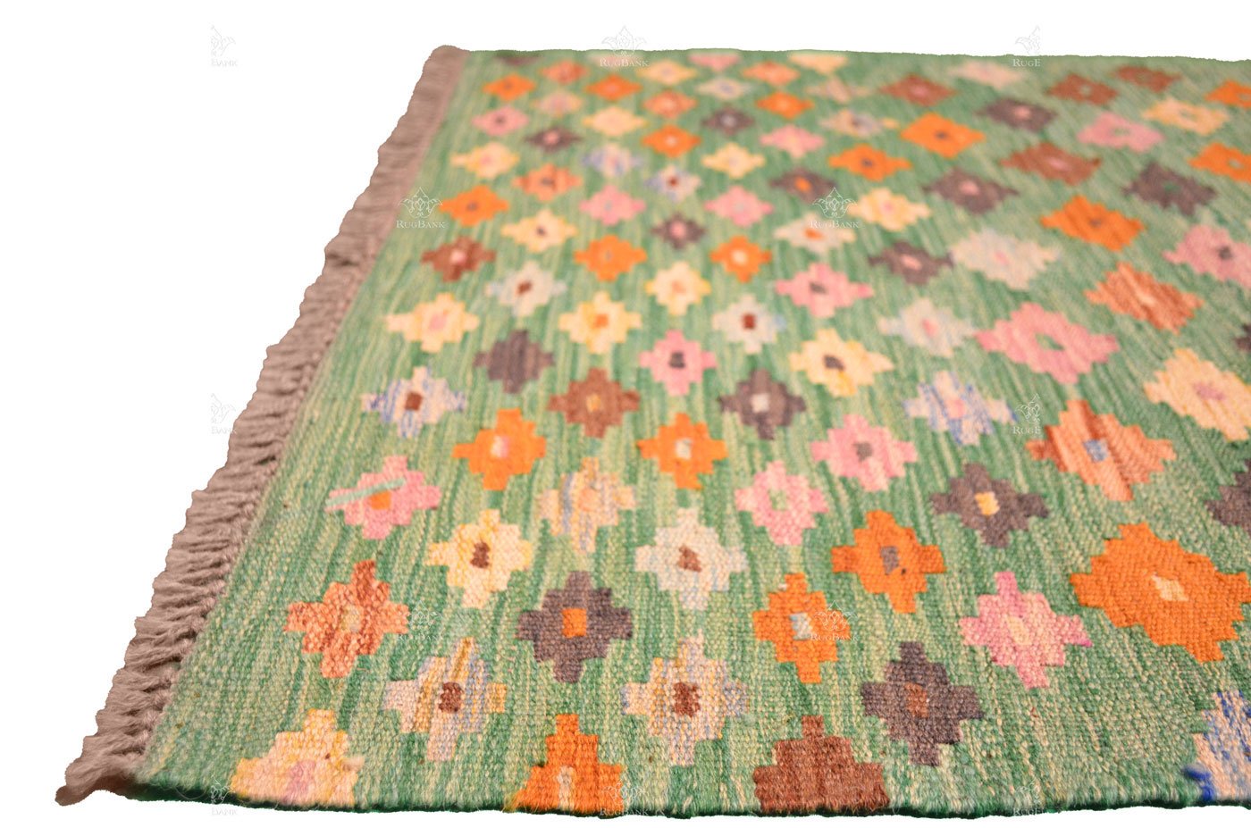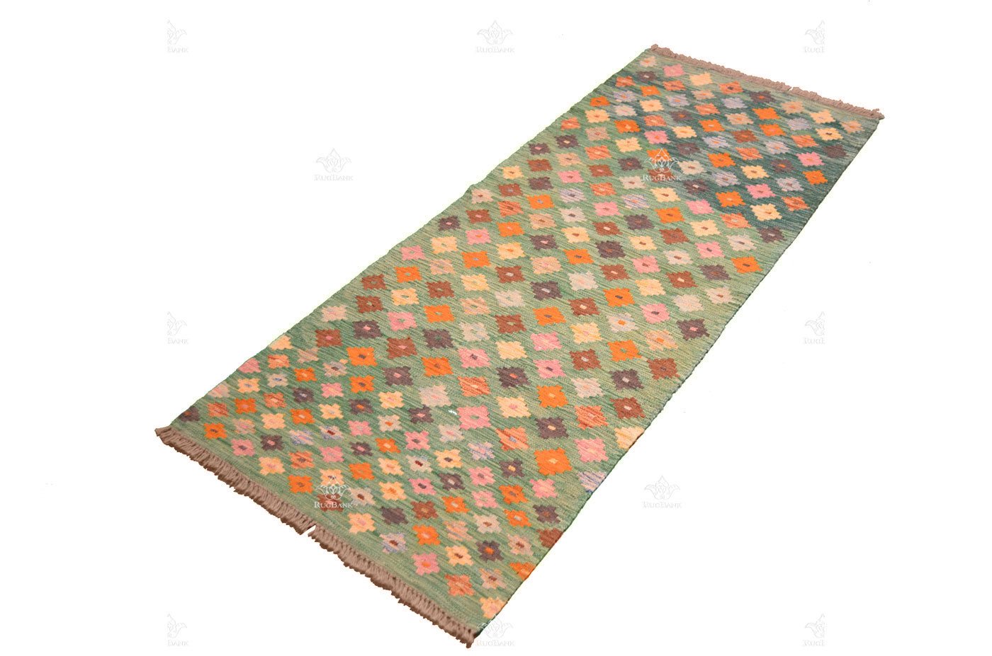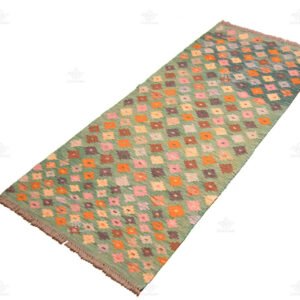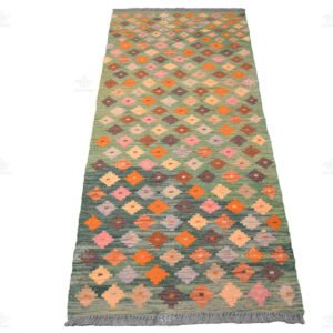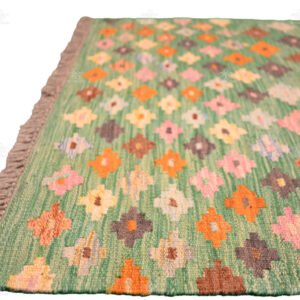 Step into the world of our Unique Handmade Runner Kilim, a vibrant creation that radiates elegance and charm. This exquisite rug boasts a bright green background that immediately catches the eye.