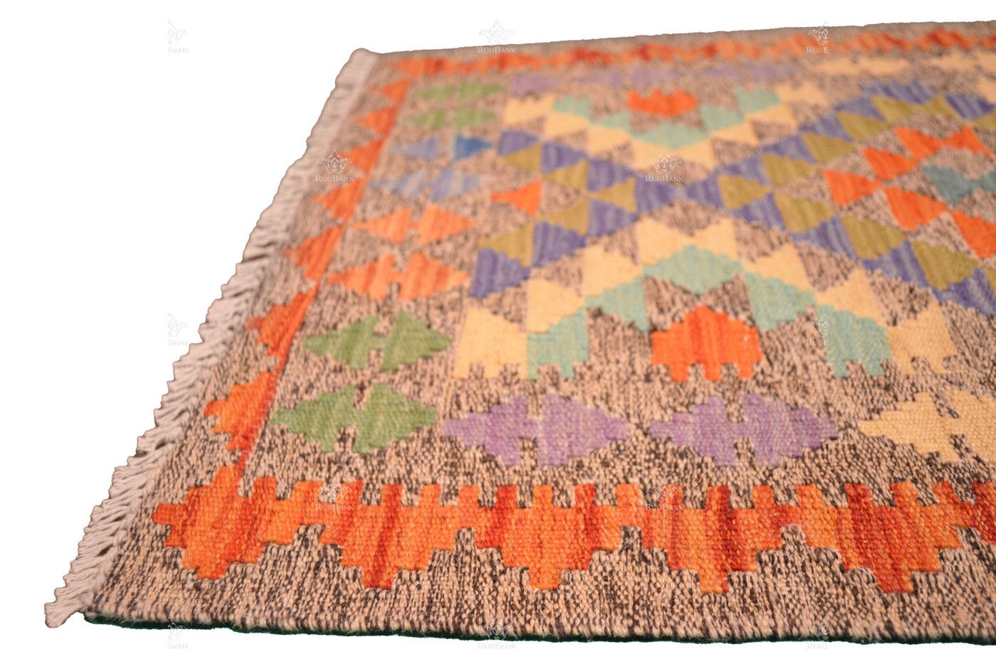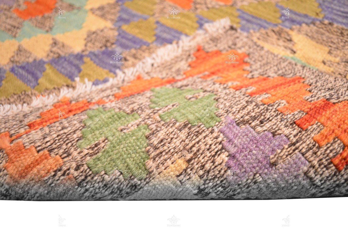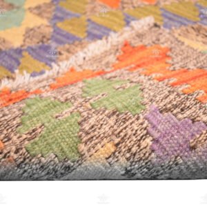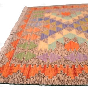 This rug’s design is a testament to the artistry of traditional kilims. Bold geometric diamond shapes, consisting of squares, adorn the surface, adding depth and character to the overall look. These patterns draw the eye and invite you to explore their intricate beauty.