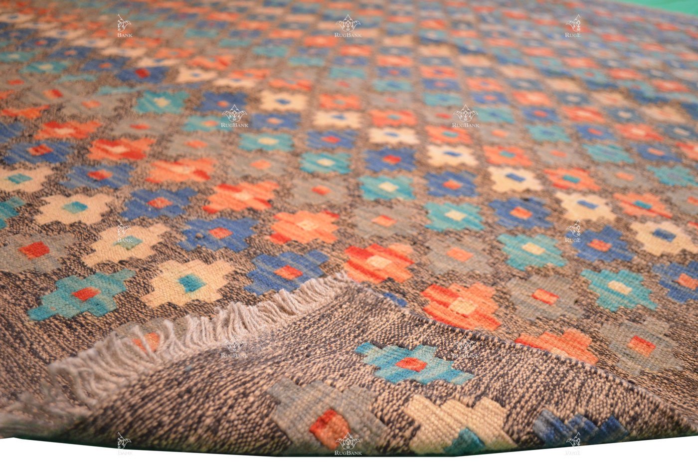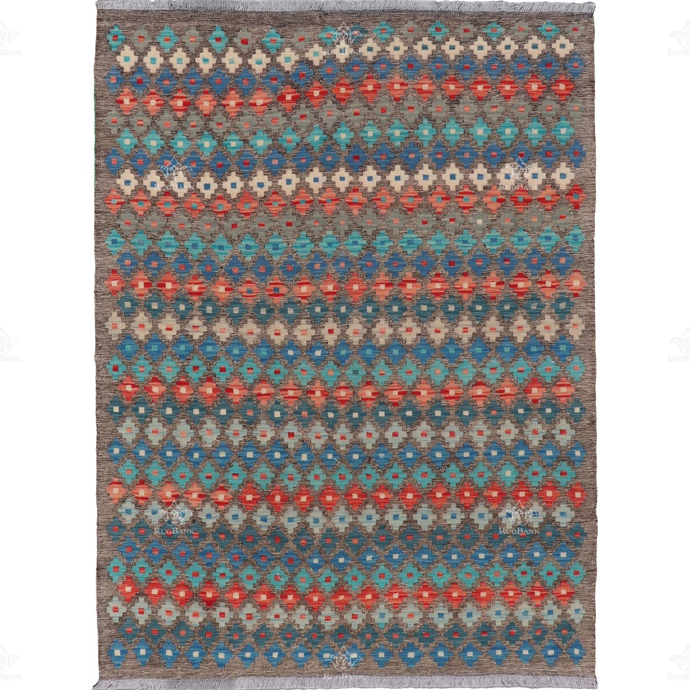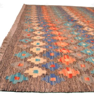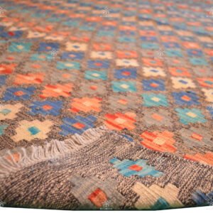 Handcrafted with care and precision, this Kilim is more than just a rug; it’s a statement of culture and artistry. Its gray background provides a sense of elegance and neutrality, allowing the multicolored geometries to shine as the stars of the show.