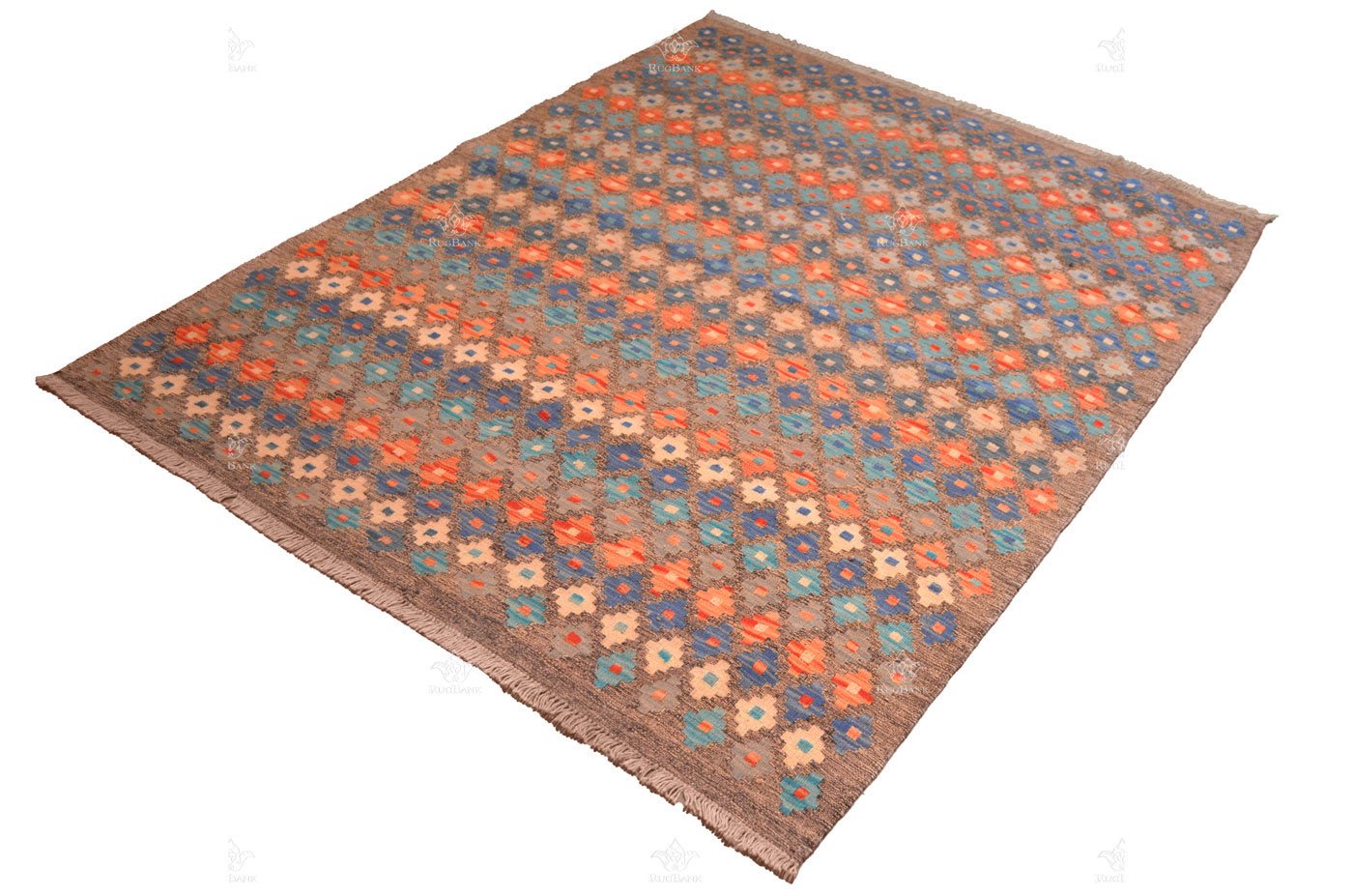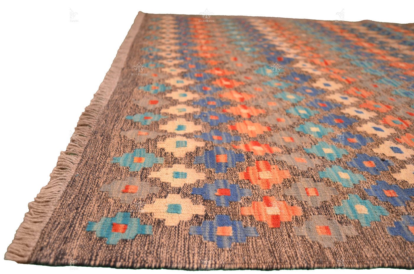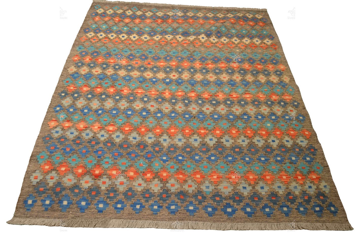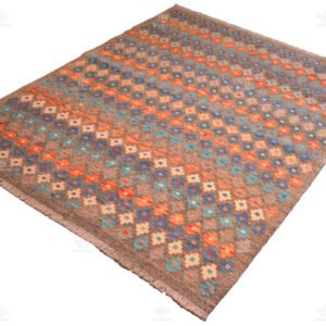 The geometric patterns on this Kilim are a visual delight, with each row of diamond shapes featuring the same color. The result is a harmonious blend of symmetry and vibrancy that adds character and depth to your living space.