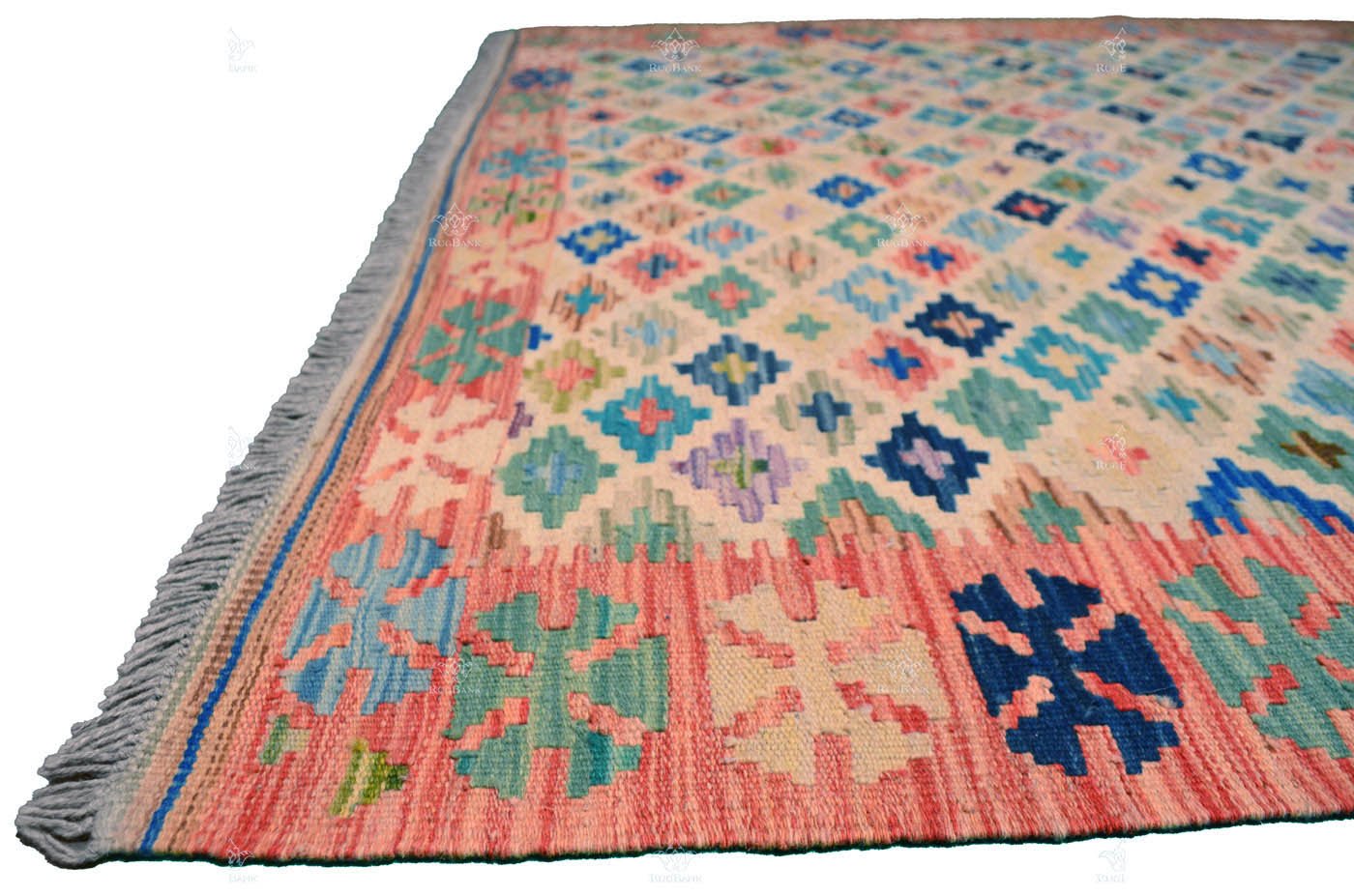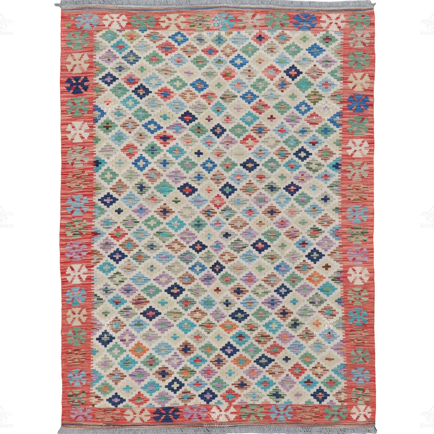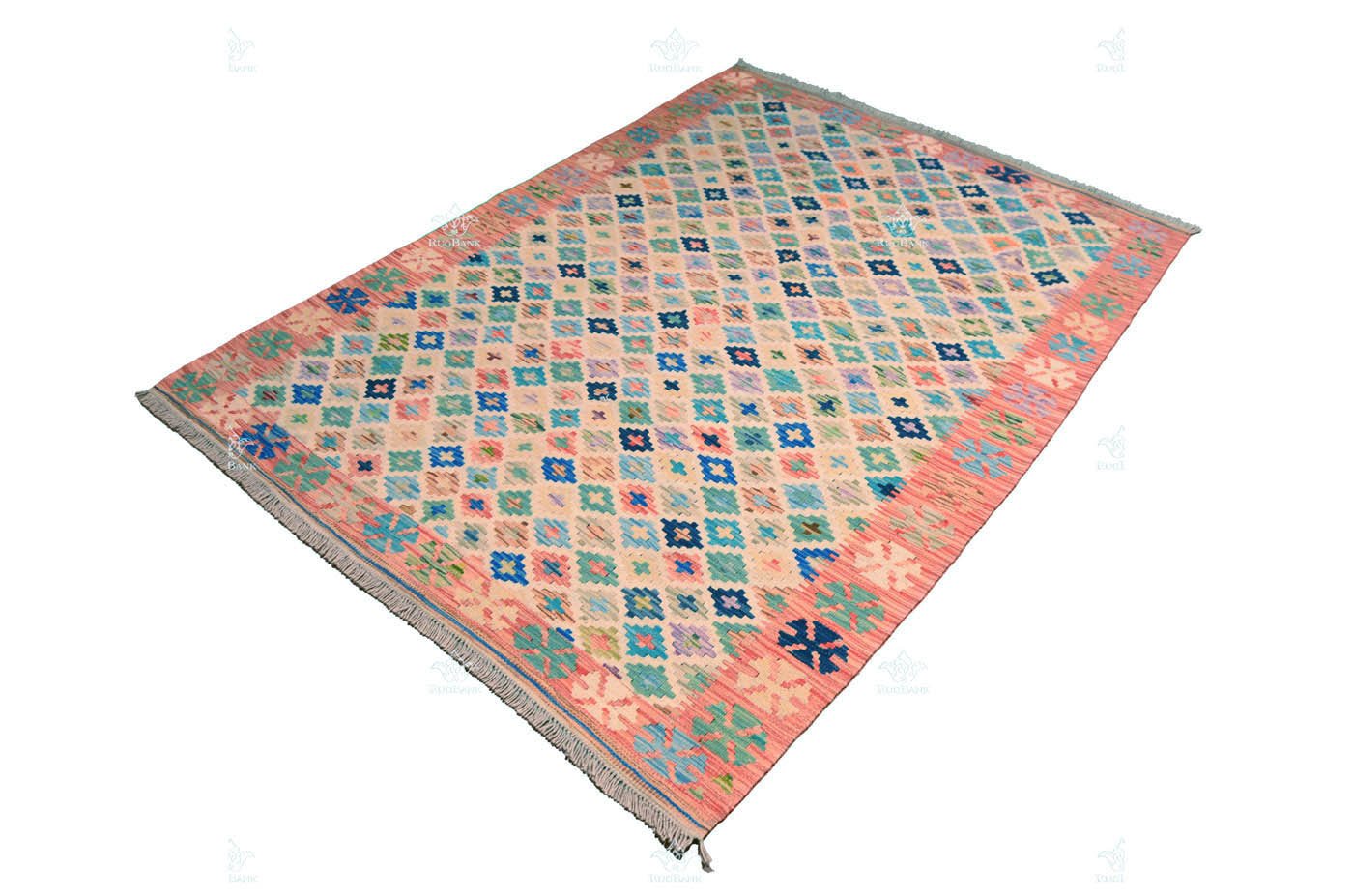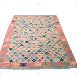 Embrace the vibrancy of a Handmade Kilim made in Pakistan, and let its multicolored charm and small Moroccan patterns take you on a journey through time and tradition right in the heart of California, USA.