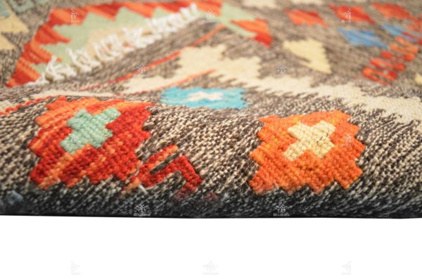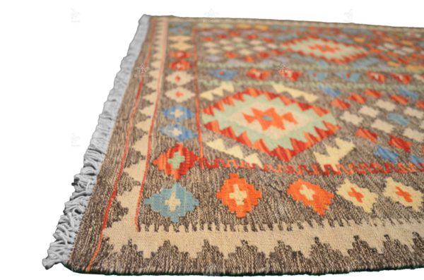 Every thread and stitch of this kilim exudes a sense of ancient artistry, mimicking the aesthetics of rugs of yesteryear. The exquisite Moroccan-inspired shapes in the center draw the eye, transporting you to the enchanting markets of Marrakech, while the intricate diamond patterns add a touch of sophistication and balance to the composition.