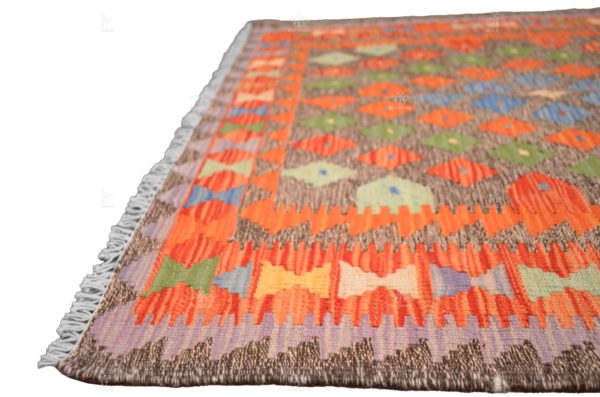 At the heart of this kilim’s design, you’ll discover two large diamond shapes, both brimming with intricate details. These central diamonds are crafted from a mosaic of smaller diamond shapes, which collectively resemble the rich tapestry of life found in the natural world. The dynamic interplay of colors, predominantly red with accents of green and blue, conjures images of landscapes, flora, and the boundless sky.